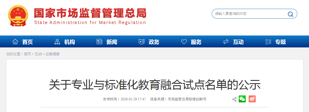 为加强兼具专业能力和标准化知识技能的高素质人才教育,根据《市场监管总局 教育部关于做好专业与标准化教育融合试点申报工作的通知》(国市监标创发〔2025〕80号)工作部署,经组织申报、审核推荐和专家评审,形成了专业与标准化教育融合试点公示名单,现予以公示。如有异议,请在公示期内将书面意见反馈至市场监管总局标准创新司、教育部政策法规司。